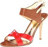The Meadea delivers a little bit of everything with its multi color look. This Ivanka Trump sandal features a glossy red patent vamp, and rich cognac leather upper. Gold metallic details trim the adjustable strap and 4 inch printed heel.